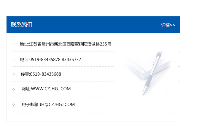 傳真:0519-83435688    郵編:213135    網址:WWW.czjhgj_com.szmycq.com    電子郵箱:JH@czjhgj_com.szmycq.com